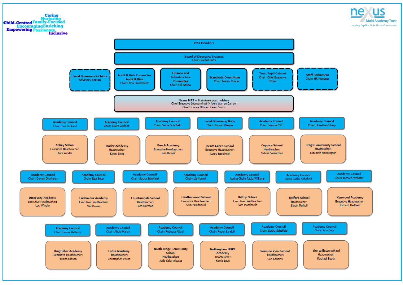 As per our Nexus MAT Articles of Association and Nexus Scheme of Delegation, each school within Nexus Multi Academy Trust has its own Academy Council, which must have a minimum of 2 parent governors in its membership. Academy Councils have powers and responsibilities delegated to them by the Trust Board of Directors and from the Chief Executive Officer, so that those people closest to a school have the prerogative to govern effectively.
